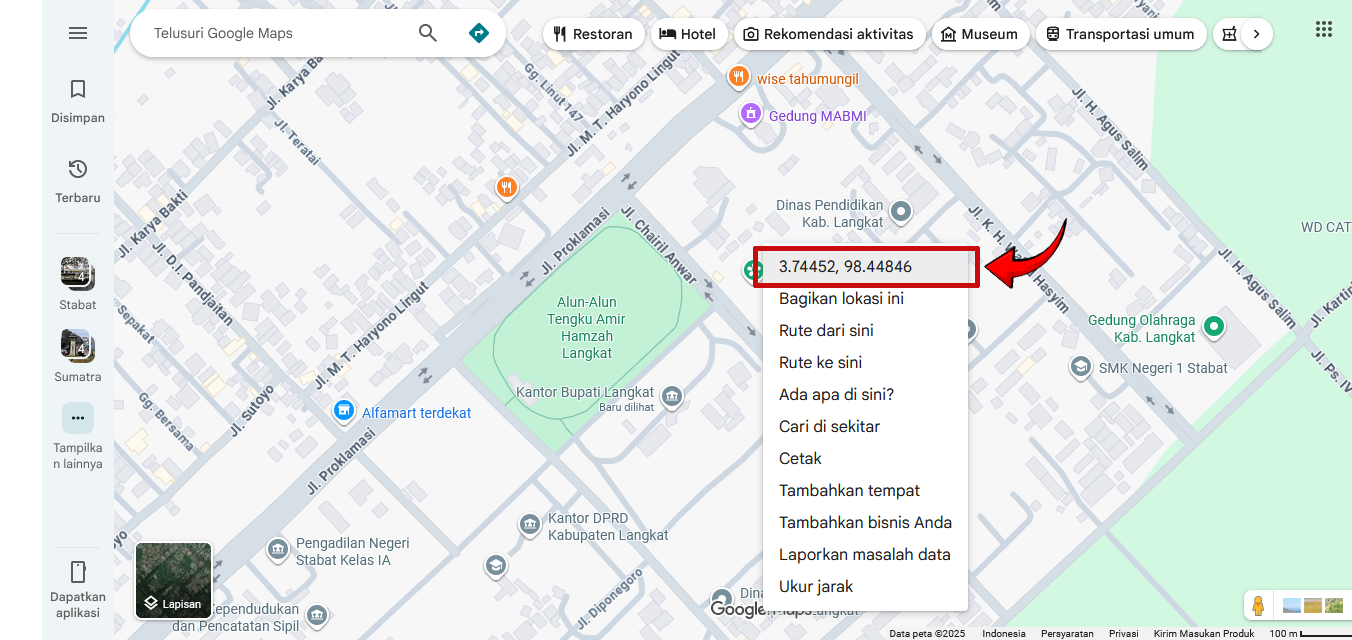 4. Pilih atau klik bagian koordinat (angka lintang dan bujur) yang muncul pada menu.